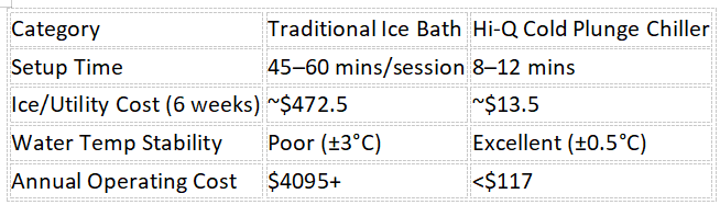 Teknisk fordel:Moderne koldt kølemødre, somHi-q kold badekøler, tilbud præcis temperaturstyring på tværs af dette terapeutiske interval. I modsætning til traditionelle isbade, der svinger med ± 3 ° C, vedligeholder HI-Qs dobbelt-kompressor-system± 0,5 ° C nøjagtighed—Kritisk til replikering af kold eksponering for klinisk kvalitet derhjemme.